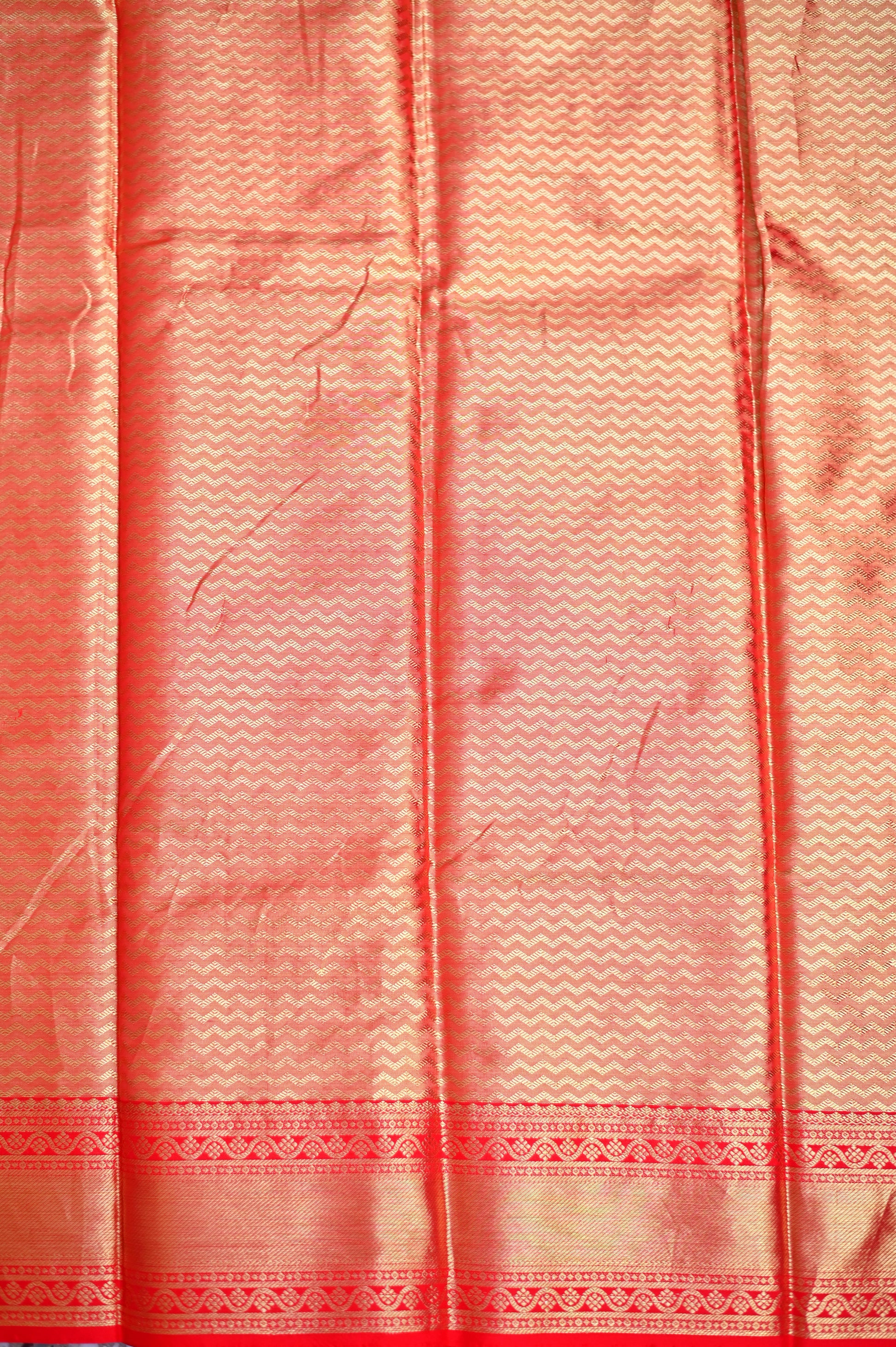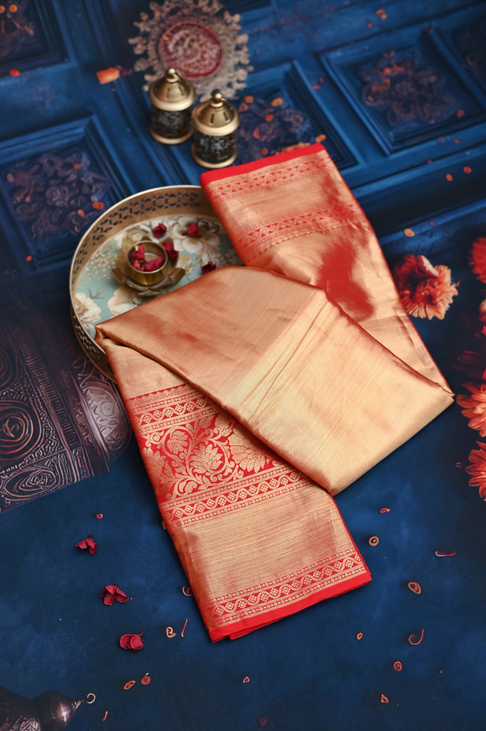 Step into timeless elegance with our Red Kanjivaram Silk Saree. Crafted from luxurious gold Kanjivaram tissue fabric, this saree is a masterpiece of intricate weaves and radiant gold hue. Experience centuries of legacy as you drape yourself in this saree, complete with an unstitched blouse attached for your convenience.