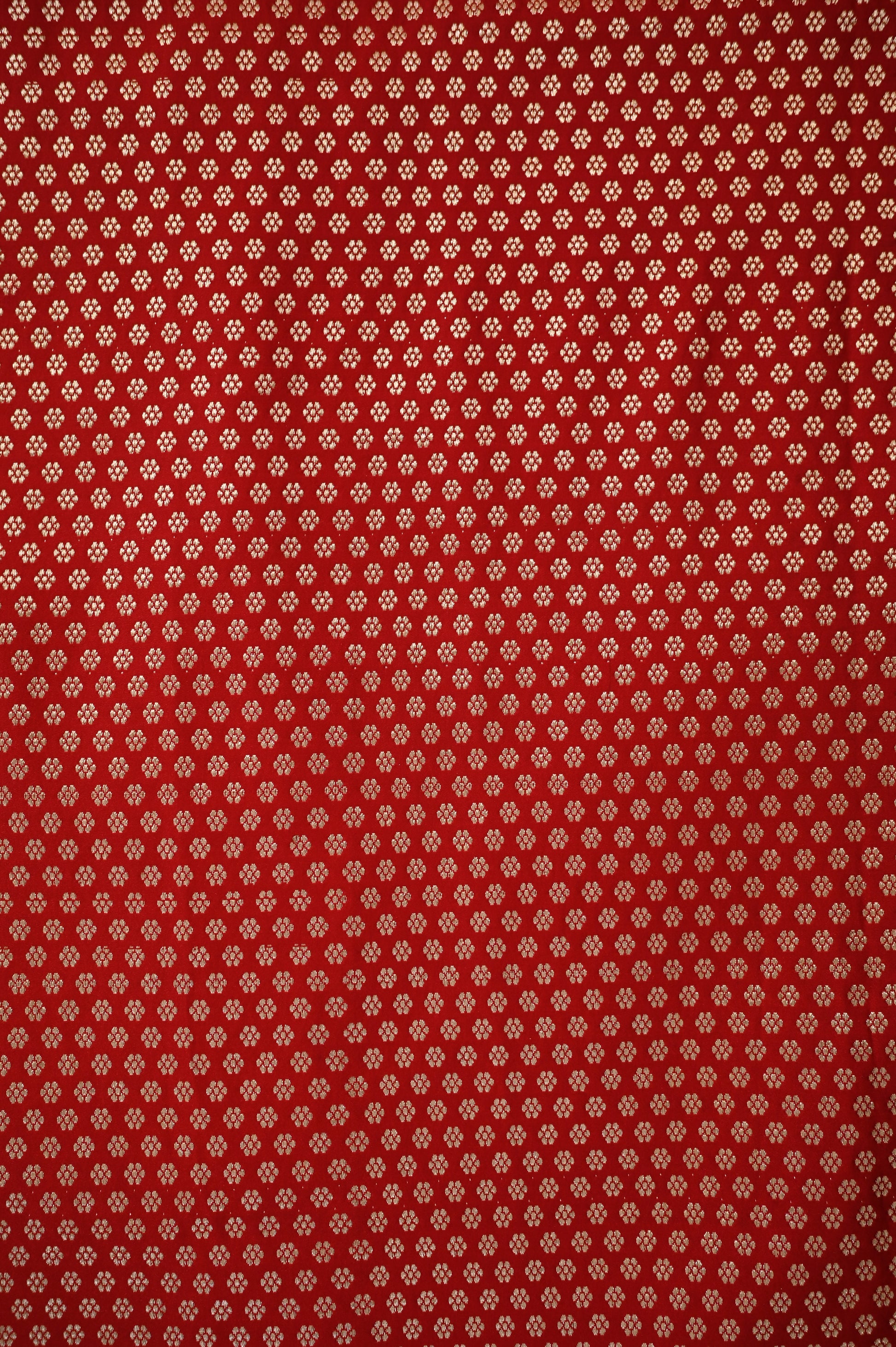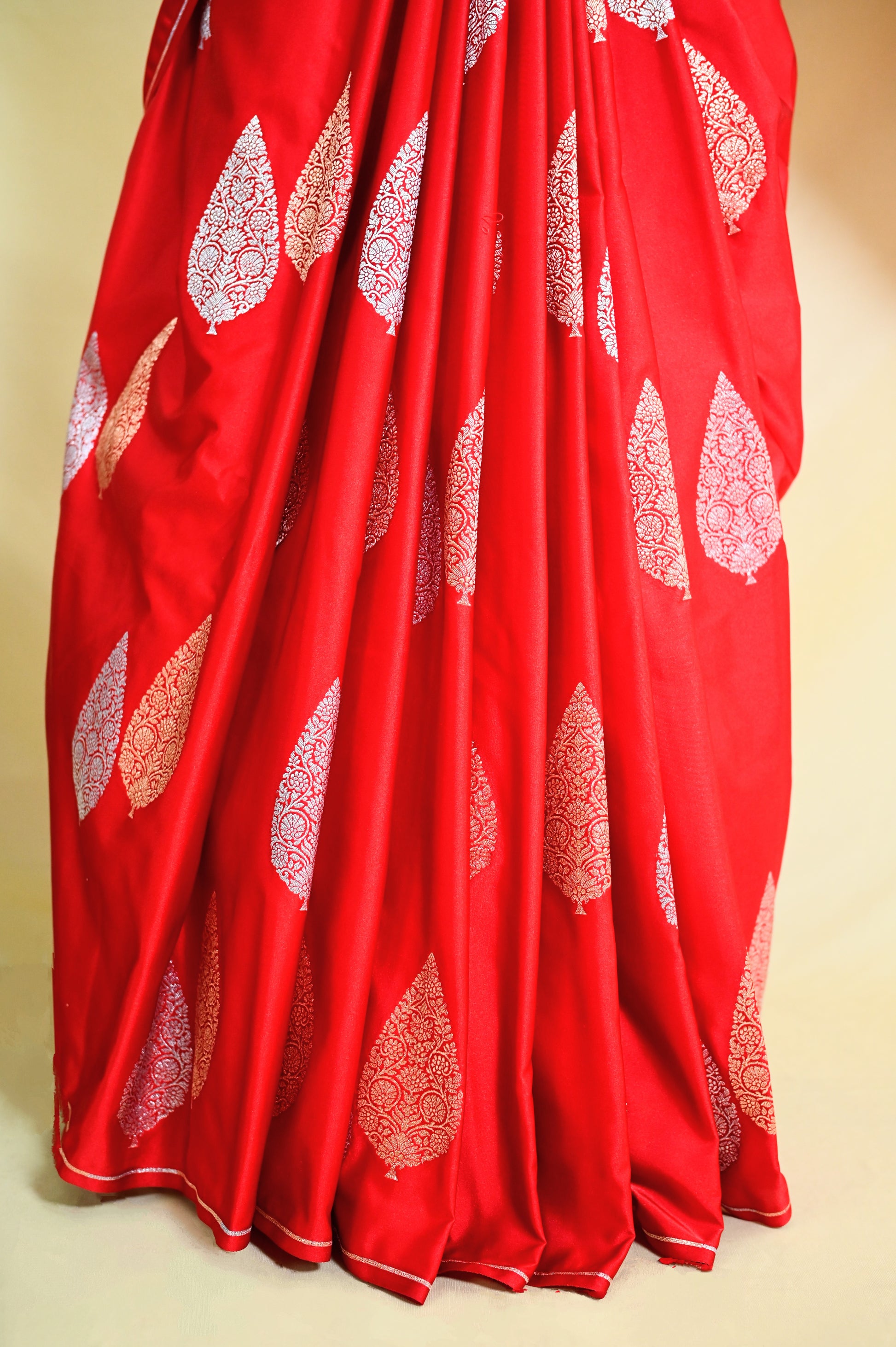 This Red Banarasi Saree showcases exquisite dual Golden and Silver Leaf designs, adorned with intricate Butta engravings.